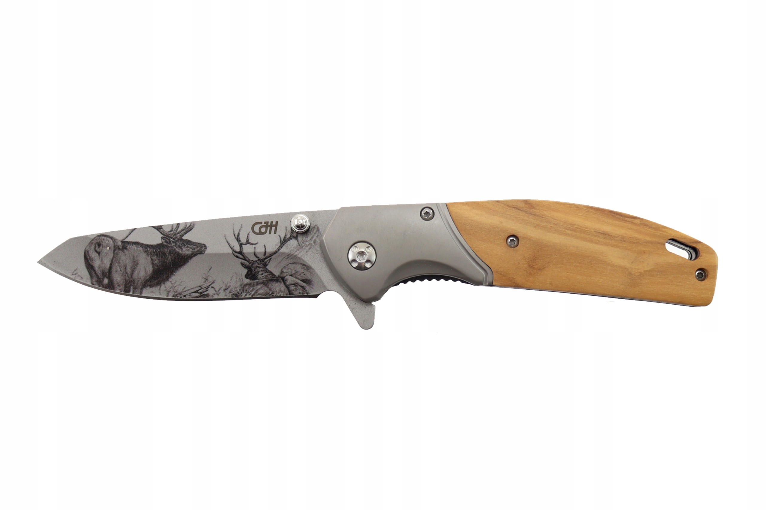 Nóż myśliwski Herbertz CJH Olive Wood z ozdobnym motywem jelenia wykonanym technologią druku 3D na ostrzu. Ostrze typu Drop Point z tytanową powłoką ochronną wykonane jest ze stali nierdzewnej AISI 420 o twardości 54-56 HRC, co zapewnia doskonałą odporność na korozję, wysoką hartowność oraz trwałość krawędzi tnącej. Głownia o wklęsłym szlifie i cienkiej krawędzi tnącej zapewnia wydajność cięcia. Mechanizm otwierający wspomagają łożyska kulkowe, a blokada typu liner lock stabilizuje ostrze.