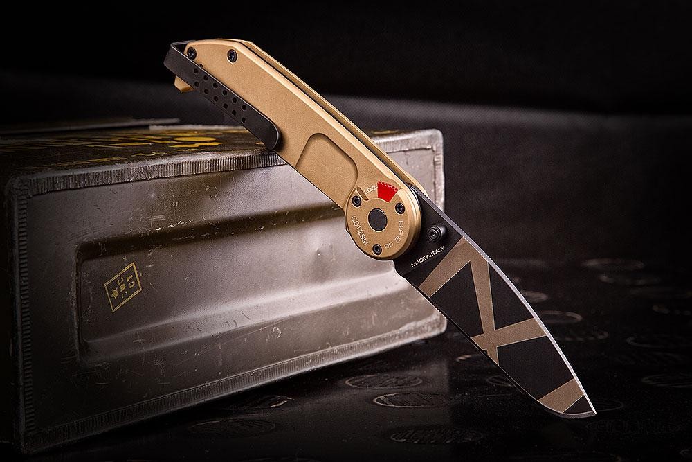 Rękojeść: anodyzowane aluminium, wykończone w kolorze Desert, z czarnym stalowym backspacerem. Całość wspiera klips mostkowy, który można zamontować po obu stronach – dyskretny i funkcjonalny.