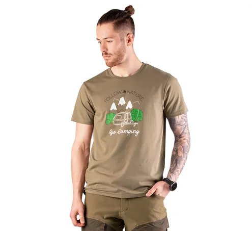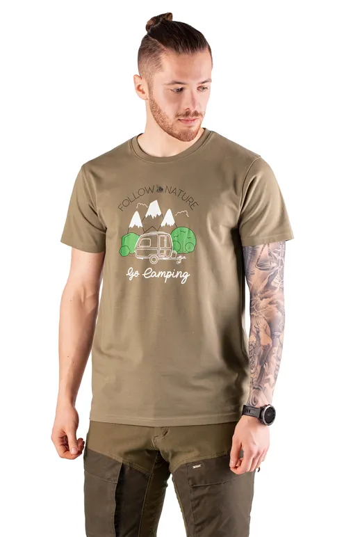 T-shirt męski Camp jest w beżowym, jasnym kolorze. Umieszczony na froncie koszulki FNT Camp, nadruk nawiązujący do klasycznej przyczepki kempingowej, wyrazi Twój charakter i zainteresowanie naturą. Koszulka spodoba Ci się szczególnie jeśli jesteś miłośnikiem turystyki górskiej, wycieczek pieszych, łowiectwa bushcraftu, lub po prostu lubisz naturę.